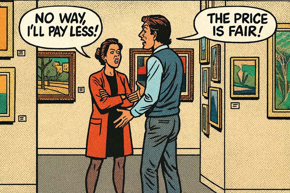 Es ist das legitime Ziel eines jeden Galeristen oder Kunsthändlers, im Rahmen von Verkäufen möglichst hohe Gewinne zu erzielen. Dazu darf er auch überlegenes Wissen zu Marktpreisen nutzen. Problematisch wird das Geschäft allerdings, wenn der Kunsthändler die Unerfahrenheit eines Käufers ausnutzt und das Verhältnis zwischen dem Kaufpreis und dem Marktwert in ein „auffälliges Missverhältnis“ rutscht. Gleiches gilt, wenn sich der Käufer über „wertbildende Faktoren“ des Kaufobjekts irrt. Etwa über den Urheber oder die Provenienz des Kunstwerks. Rechtsanwalt Dr. Louis Rönsberg, der auf Kunstrecht spezialisiert ist, rät daher bei der Preisfindung zur Vorsicht. Denn auch ein Antiquitäten- oder Kunstkaufvertrag kann wegen sittenwidrigem Wucher (§ 138 BGB) nichtig sein. Oder der Käufer hat ein Anfechtungsrecht wegen Irrtums (§ 119 Abs. 2 BGB).